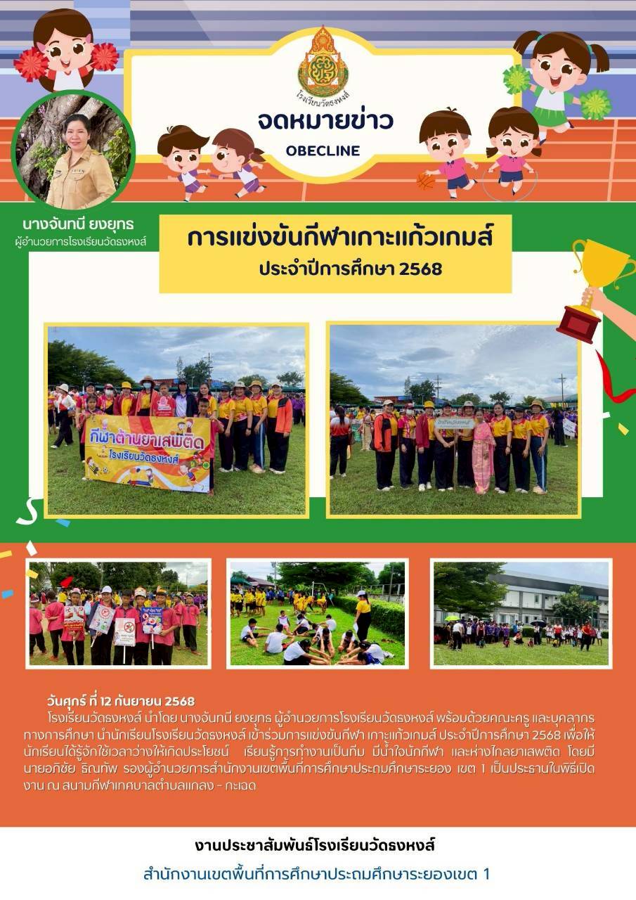วันศุกร์ ที่ 12 กันยายน 2568 โรงเรียนวัดธงหงส์ นำโดย นางจันทนี ยงยุทธ ผู้อำนวยการโรงเรียนวัดธงหงส์ พร้อมด้วยคณะครู และบุคลากรทางการศึกษา นำนักเรียนโรงเรียนวัดธงหงส์ เข้าร่วมการแข่งขันกีฬา เกาะแก้วเกมส์ ประจำปีการศึกษา 2568 เพื่อให้นักเรียนได้รู้จักใช้เวลาว่างให้เกิดประโยชน์ เรียนรู้การทำงานเป็นทีม มีน้ำใจนักกีฬา และห่างไกลยาเสพติด โดยมี นายอภิชัย ธิณทัพ รองผู้อำนวยการสำนักงานเขตพื้นที่การศึกษาประถมศึกษาระยอง เขต 1 เป็นประธานในพิธีเปิดงาน ณ สนามกีฬาเทศบาลตำบลแกลง - กะเฉด